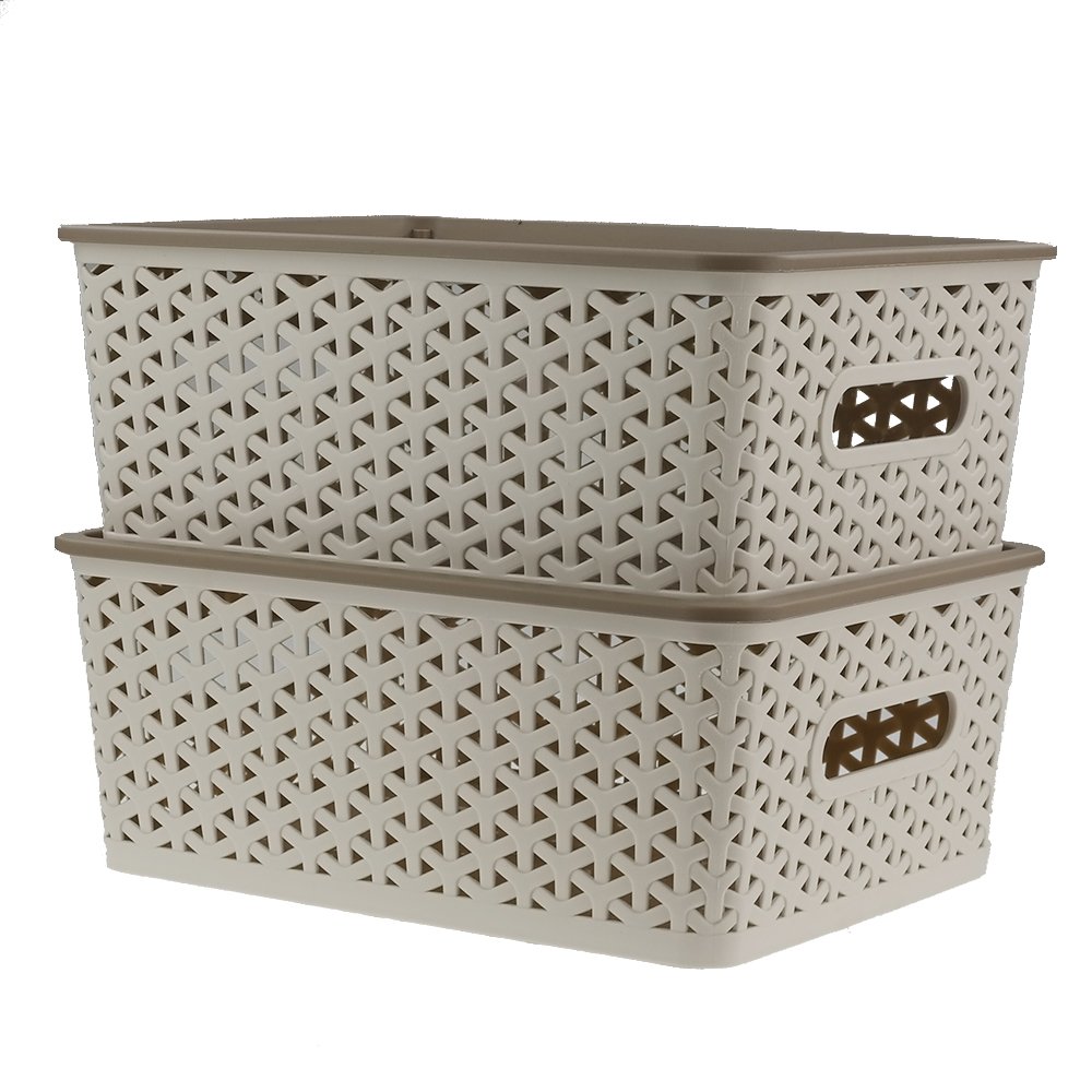 Ggbin 8 Quart Plastic Woven Storage Basket with Lid in Khaki, Set of 2