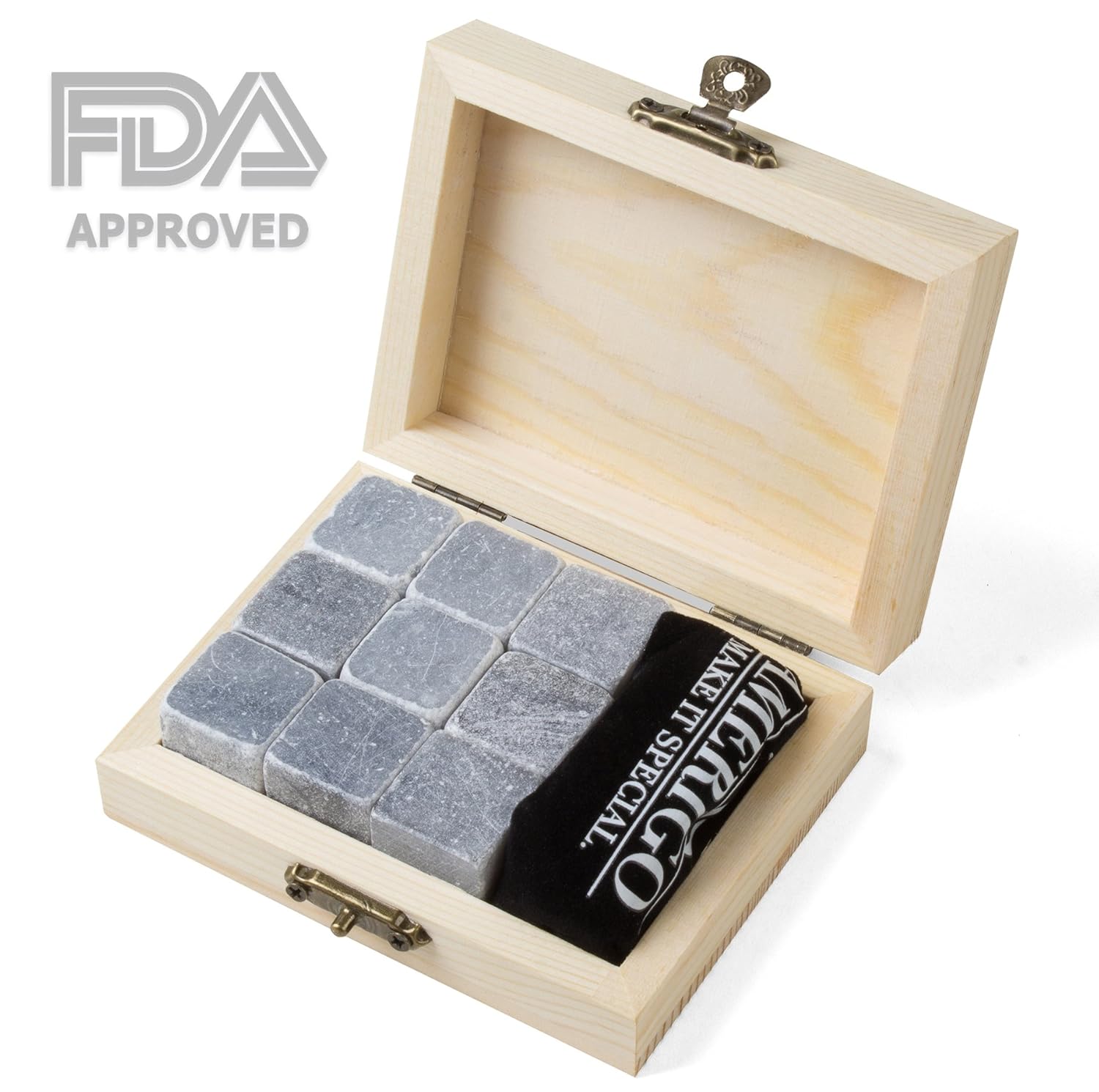 Premium Whiskey Stones by Amerigo - Water Down Your Whiskey? Never Again ! Set of 9 Chilling Whiskey Rocks - Packaged in an Exclusive Wooden Gift Set - Ice Cubes - Drinking Rocks - Free Velvet Pouch